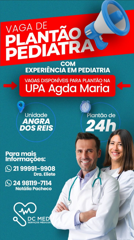 A DC Med Serviços Médicos está com vagas abertas para plantão pediátrico na UPA Agda Maria, localizada em Angra dos Reis, para o mês de julho de 2024. A oportunidade é voltada para médicos pediatras com experiência comprovada na área, para integrar a equipe em regime de plantão de 24 horas.